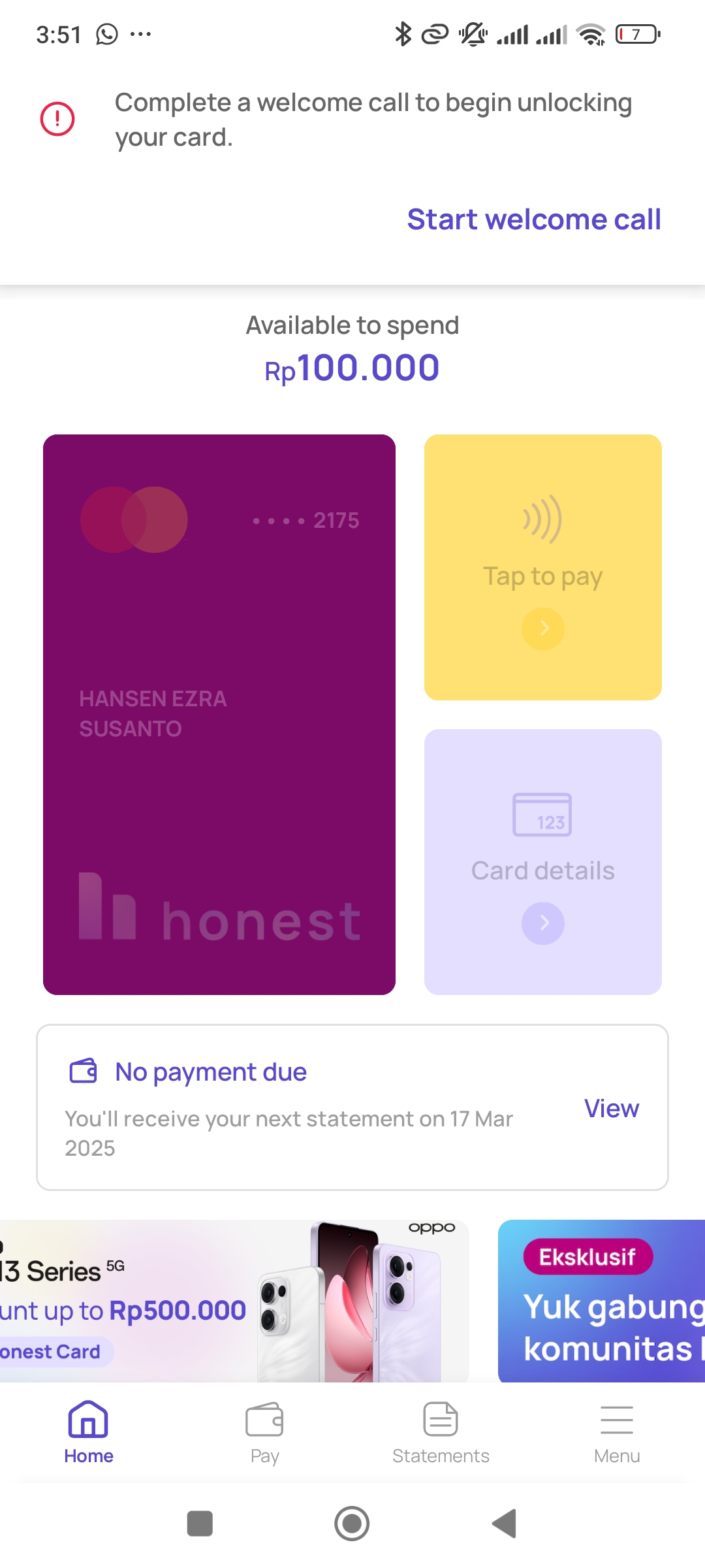Hi guys mau tanya , limit kartu honest paling rendah itu berapa sih ? Sy dapet limit cuma 100rb ini sih epic hahahahahaScreenshot_2025-02-21-15-51-26-952_com.honestbank.android.jpg365.04KB